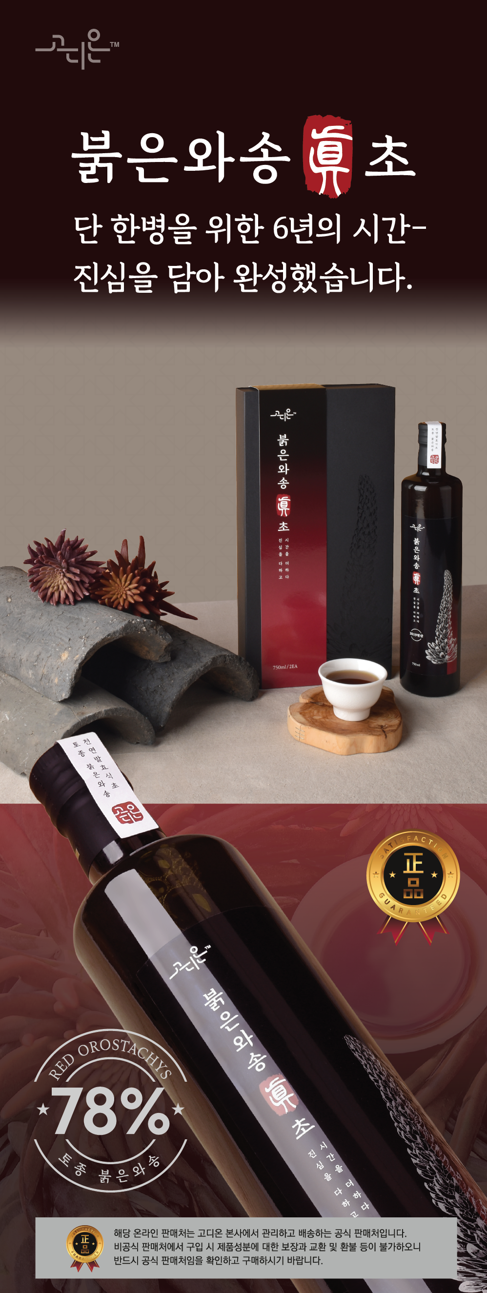 제품특징 및 원재료명 | 누룩,주정,물을 일체 사용하지 않음 100% 와송 자체수액 1년이상발효 6년이상 숙성 천연 발효된 와송식초 와송78% 원당20% 설탕2% | |||
